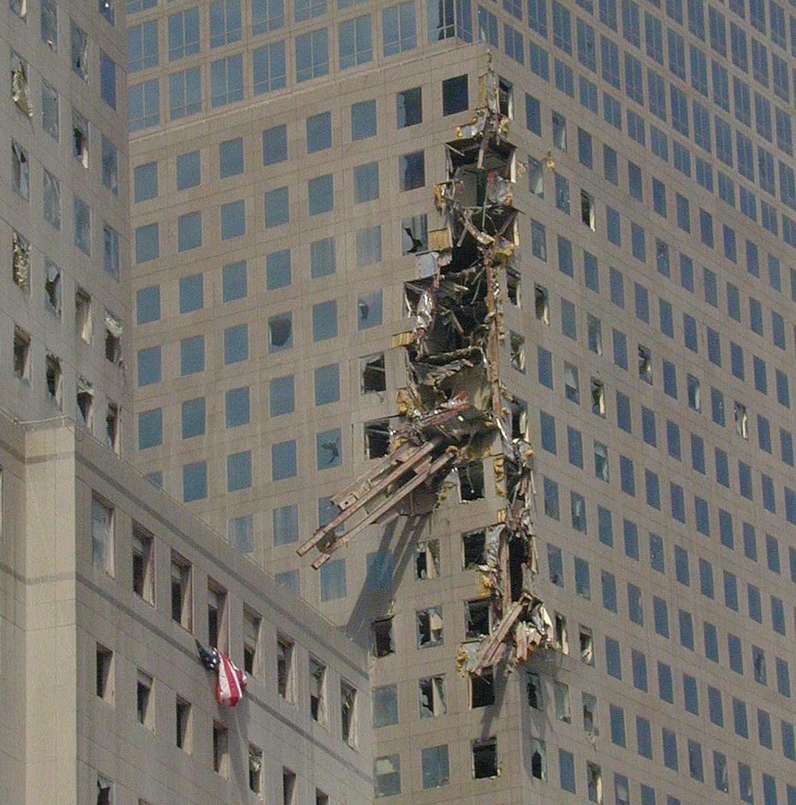 This photo shows an external framing section impaled in WFC 3, over 500 feet away from the North Tower.