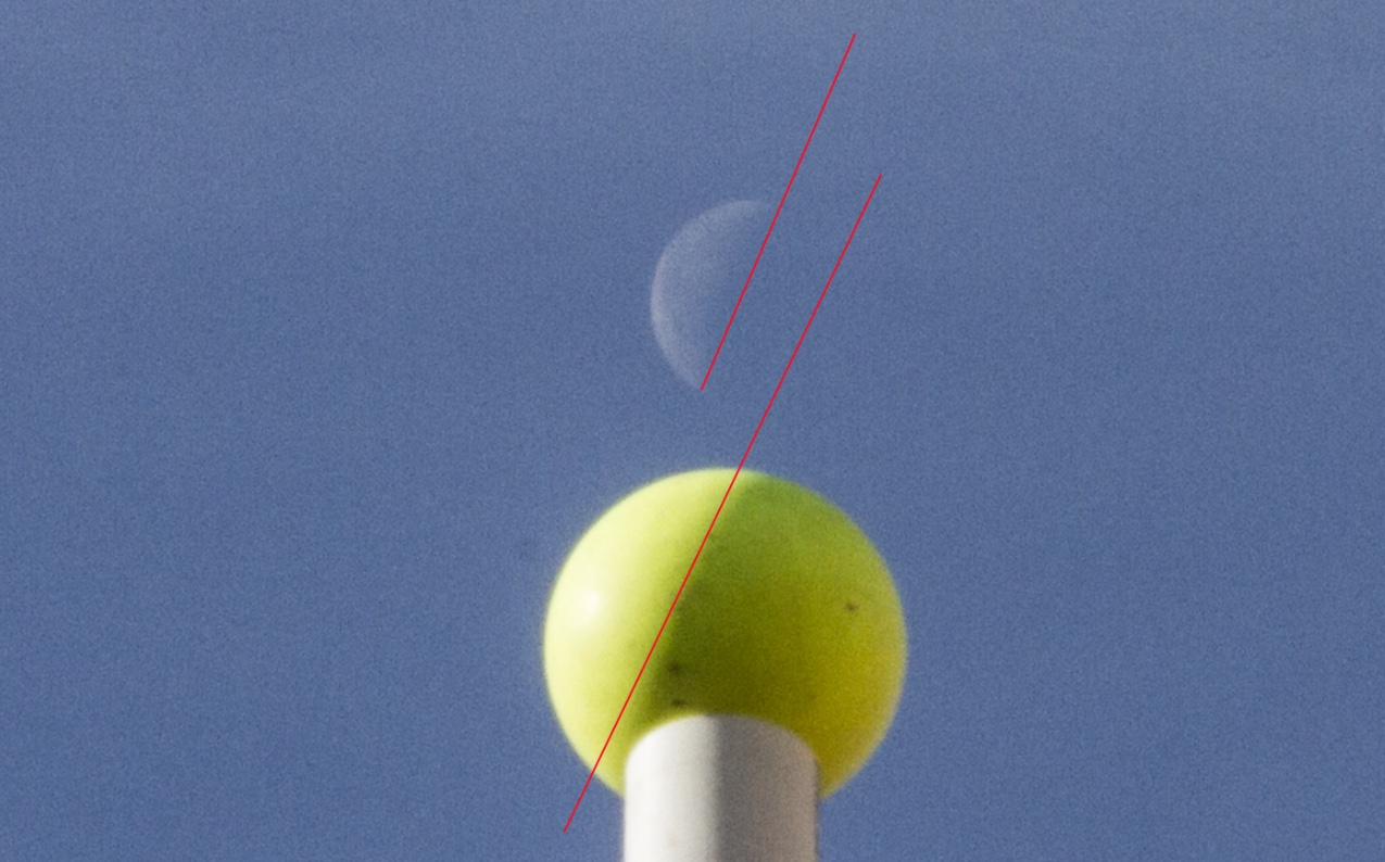 Nice capture, but it could be much better if the yellow ball were to be either in front or behind the Moon, not at either below or above, so that both would be equally perpendicular to the Sun. Also, take the picture during Sunset or Sunrise when the Sun is almost touching the horizon, as the atmosphere's refraction effects are stronger on/at the Earth's surface. The red line on the ball is not aligned perfectly with its t-line, I can see by slightly diverging my eyes to align the Moon's t-line with the ball's t-line, they appear to be perfectly parallel, except the ball's red line.