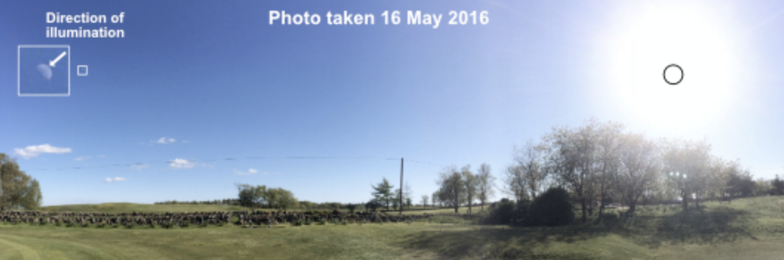 Here's the 'great Circle' path of the sunlight, superimposed onto Trailblazer's image. This corresponds to the brim of FatPhil's hat.