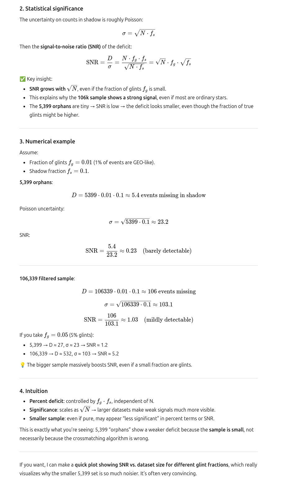 • Even if a smaller fraction of these 106k are actual glints, the large number of events inflates the absolute deficit — and so the percent difference appears larger and statistically stronger.