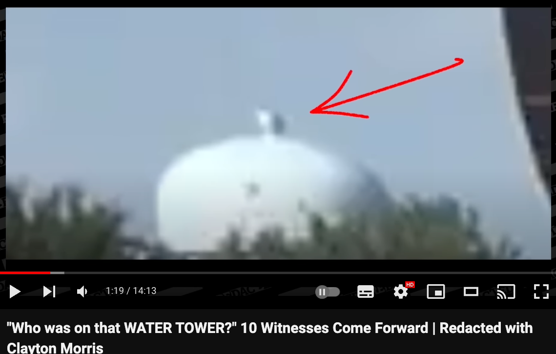 There was obviously a rumour in the crowd that someone was at the water tower. Whether this was some acousitc misperception or was started by some illinformed local officer we don't know, but it's interesting that the witnesses seem very sure about their facts (insert Trump rally attendee's grasp of facts joke here). It seems unlikely those interviewed would have seen the video yet. So only afterwards do we get "analysis" by YouTuber's claiming that the video supports the witness testimony [it doesn't].
