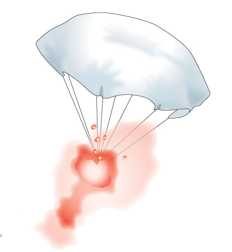 I'd assume if the debris were parts of a parachute, they'd be more flippy floppy. They seem too stable to be cloth.The three 'orbs' that certain people are suggesting are ejecting themselves from the main UFO after the missile collision look to me like they are attached by strings to the main body of the object. Does this add credence to the alternative suggestion that the object was a parachute flare, and the missile damaged the 'chute part causing it to tumble to the ground (ocean) ? This is what I'm thinking I'm seeing ...