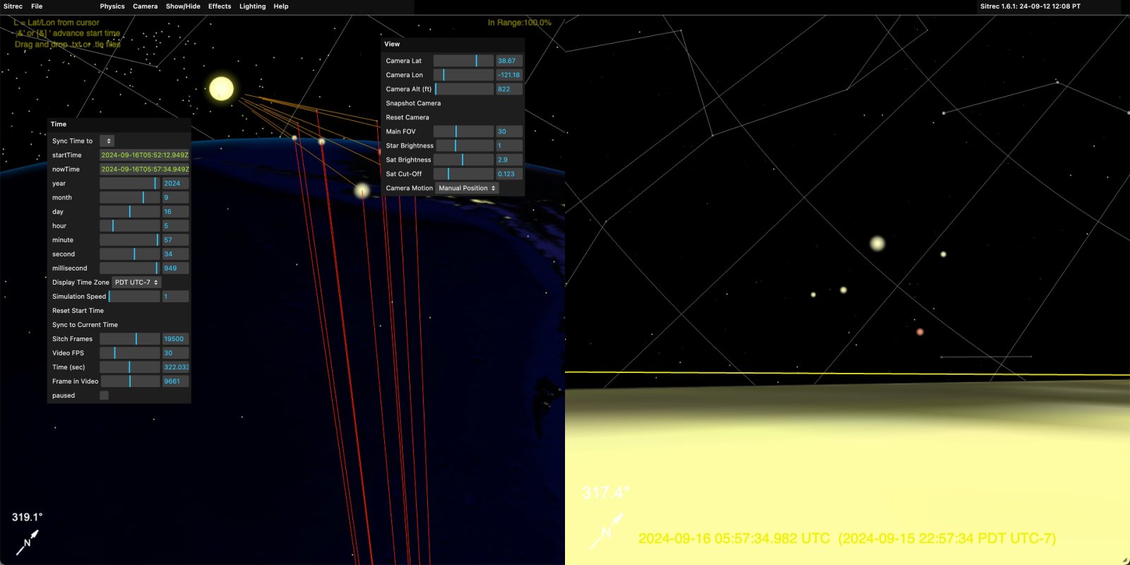 Two satellites following different paths converge on a star. Satellite A is heading from our left, up to our right at a shallow angle to the bottom of the frame. Satellite B is heading from our right to our left, at a greater angle to the bottom of the frame. They converge on a star, which I've labeled, and crisscross. Then two more satellites follow satellite A on the same path.