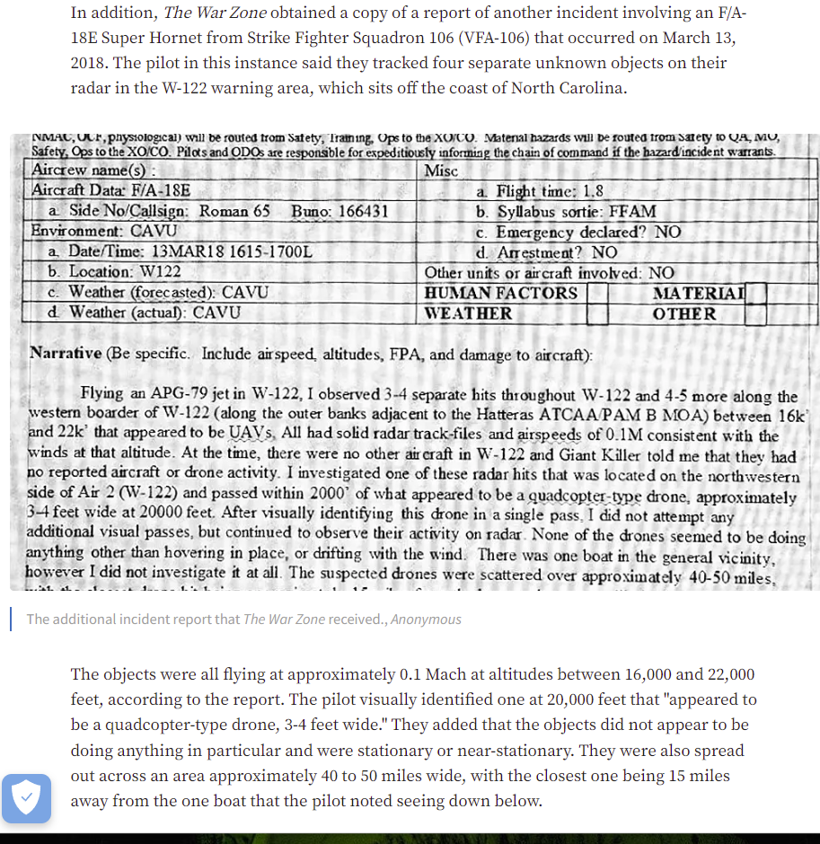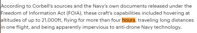I mean Corbell can selectively quote all he wants, but the Navy pilot specifically says it looked like a quadcopter.According to this article quoting Corbell on the 2019 incident. An anonmyous crewman said some of the objects were flying for 4+ hours and reached 21k feet.