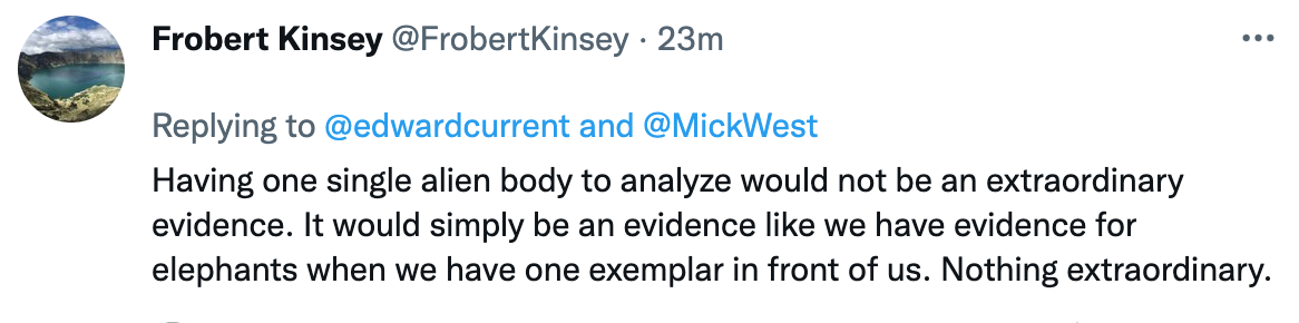 Just leaving this here. Seems like we all agree that having a physical alien body available for inspection and verification would convince us skeptics. But at least one person thinks such evidence would not be extraordinary evidence....