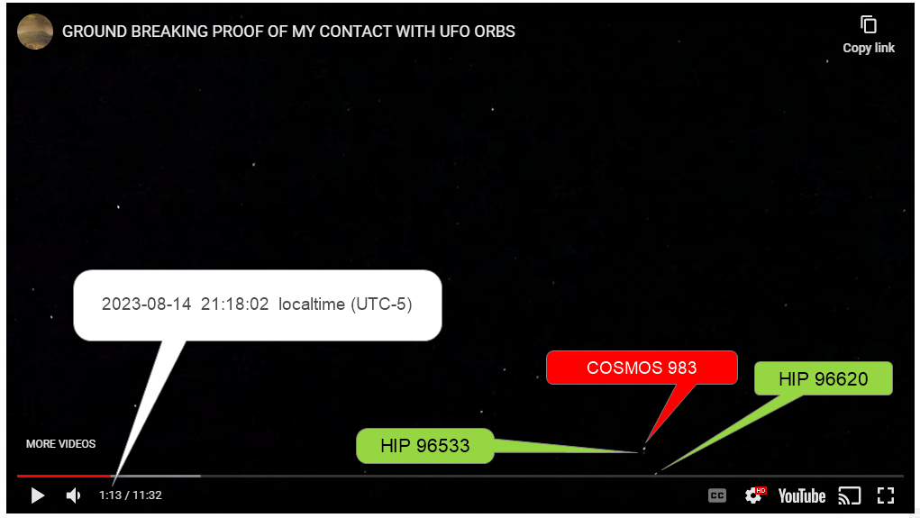Knowing these basic facts I was able to determine that the "UFO ORB" he made contact with was in fact NAVSTAR 16 (USA47), an old retired, and tumbling GPS satellite. At 1:12 into the video, we also get another fleeting faster satellite that he zooms out to capture more of before returning to his "UFO ORB" and this is identified as COSMOS 983. I suspected at the time he didn't want to give his location because it lends itself to this analysis. But recent events (this thread) have allowed for it to now happen.