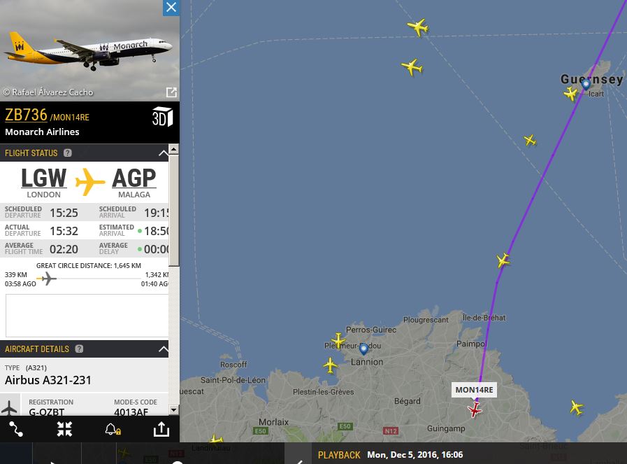 Flightradar info for the flight passing over Dunkirk.