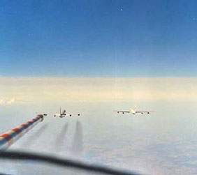 jet aircraft with different engines  flying wing by wing. Photographs document the existence of an altitude