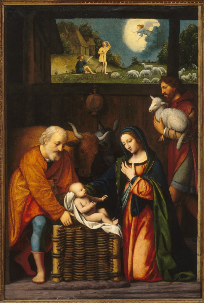 In the Cinquecento the cloud expands in scale. Raphael's Sistine Madonna (1512) stands on a mass of cherub-heads you can only read as cloud. Correggio, in the dome of Parma Cathedral (1526–30), fills the entire architectural space with a whirl of cloud-borne figures around Christ ascending. Jacopo Bassano in his Venetian Annunciation-to-the-Shepherds (c. 1560) makes the cloud a theatrical burst of gold and dark blue, the angel plunging out of it. Every painter is working off the same grammar: the cloud is the carrier of the sacred.