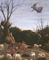 A century later, the Florentine Quattrocento workshops — Ghirlandaio, Lippi, Botticelli, di Credi, Mainardi, Sellaio — treat the vignette as a stock assembly. You can see the same angel-cloud-shepherd cell repeated across paintings that have nothing else in common with one another, dropped into Nativities as a kind of narrative widget. Fra Angelico systematises the larger "opened heavens" in his Annunciations; Sano di Pietro paints the angel literally made of cloud, emerging from the vapour at the head. The Sforza Hours (c. 1500) reduces it to a manuscript-miniature cloudlet full of cherubim over a tiny Nativity.