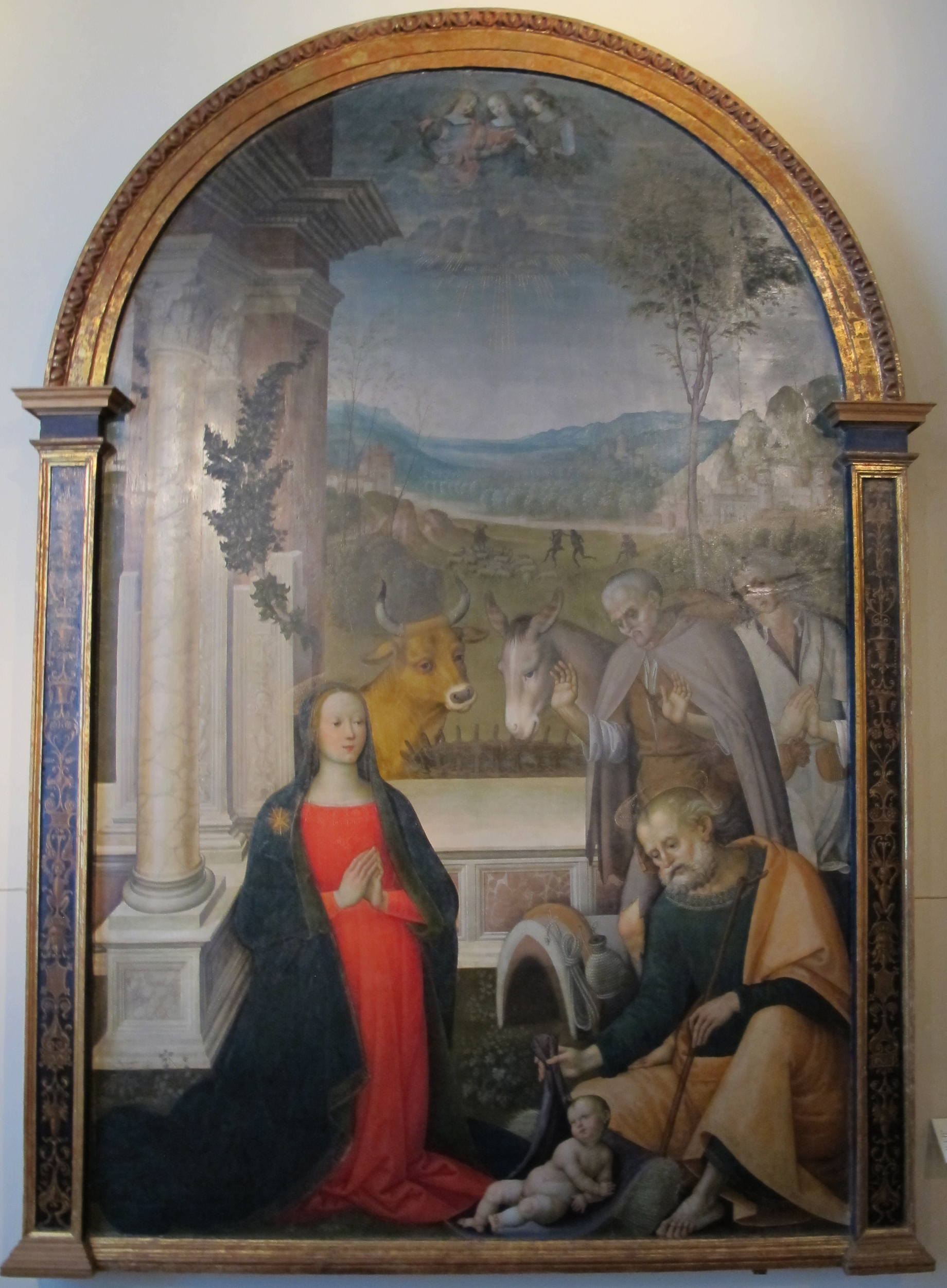 And the apocryphal Nativity in the Protevangelium of James (2nd century) gives the painters their single most reused image. Where Luke only has "the glory of the Lord", James has a luminous cloud that actually shelters the cave of the Nativity, so bright "the eyes could not bear it". That detail — light too strong to look at — is why, in hundreds of Nativities for the next fifteen centuries, a shepherd raises his hand to his forehead. It comes from James, not Luke.